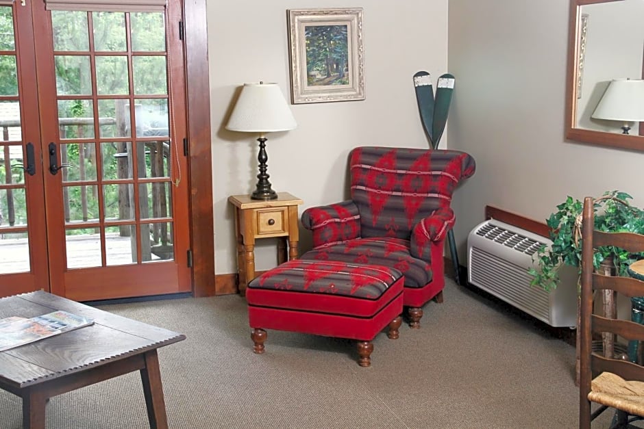 Chalet-style master suite with a spa bath, river-rock fireplace, a cable TV, a fridge and tea/coffee-making facilities. Has a private deck facing the Rogue River.